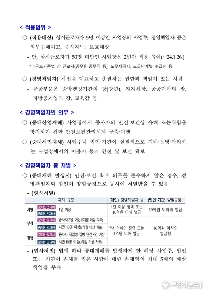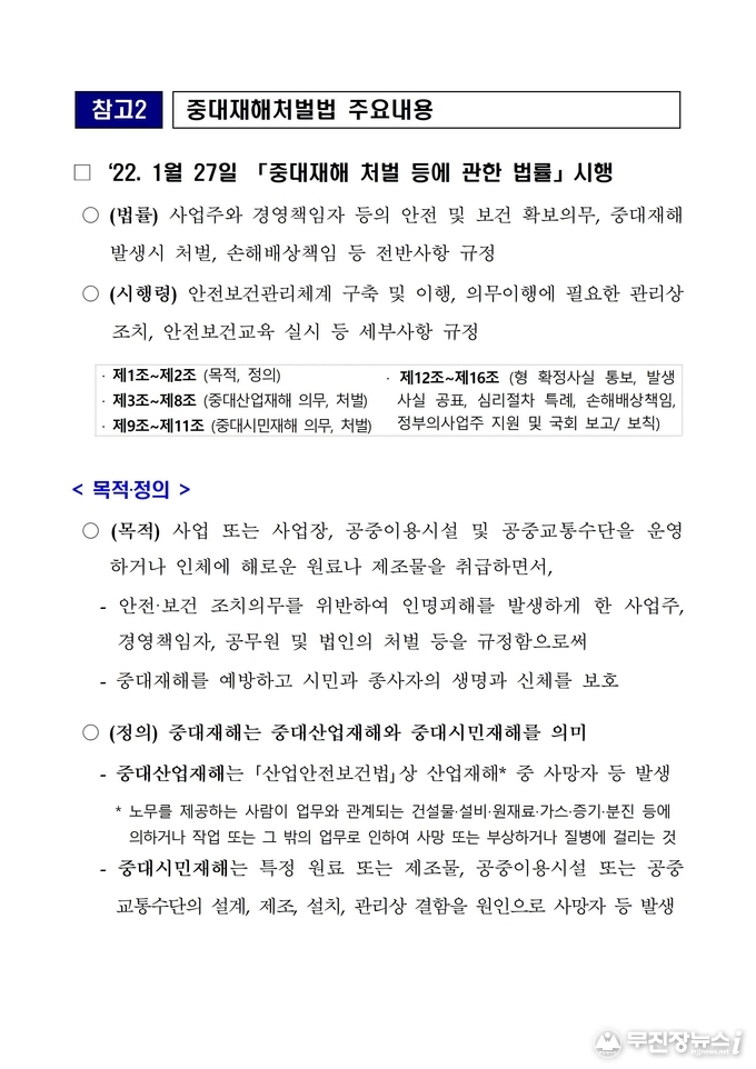 마지막으로 “경영책임자분들께서는 중대재해를 예방하기 위한 실질적인 노력을 해주시고, 현장작업자 등 근로자들도 기본적인 안전수칙과 표준 작업절차에 따라 안전하게 작업에 임해주시길 당부드린다”고 말했다.
