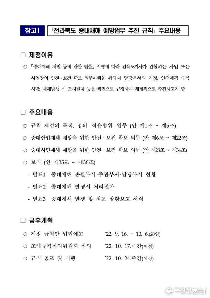한편, 입법예고 중인 「전라북도 중대재해 예방업무 추진 규칙안」은 전북도청 누리집 알림마당 입법예고 또는 전북도보(제2862호)에서 확인할 수 있다.