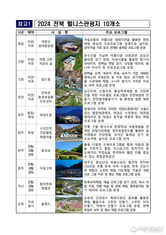 전북자치도는 2023년부터 매년 10개소씩 전북형 웰니스 관광지를 발굴해왔으며, 올해까지 총 30개소를 선정했다. 이들 관광지는 전북만의 매력을 담은 웰니스 여행상품을 개발 및 운영해 전북을 대표하는 힐링 관광지로 육성할 계획이다.