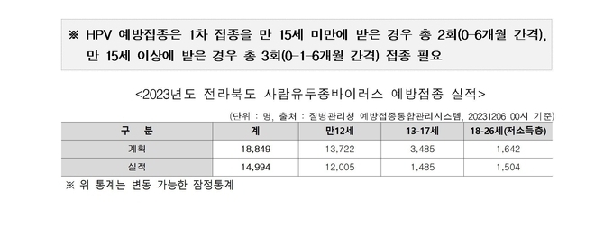 이송희 전북도 복지여성보건국장은 “백신의 충분한 예방 효과를 위해 필요한 횟수만큼 접종에 임하는 것 또한 중요하다”고 강조하며, “18~26세 저소득층 여성도 지원자격 기준 해당 여부를 확인하여 접종을 완료할 것”을 당부하였다.