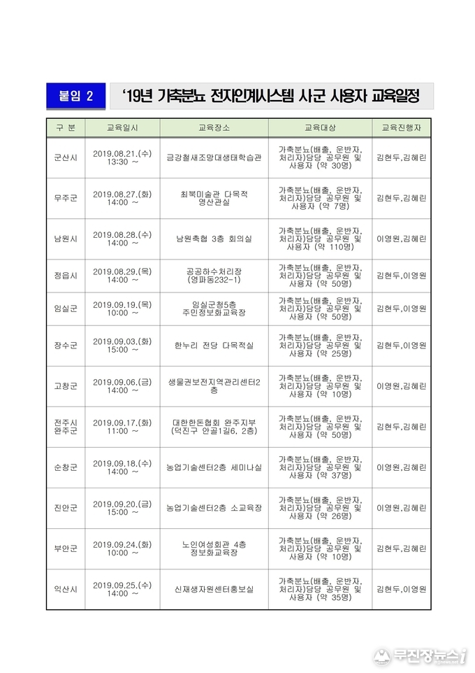 전라북도는 시스템의 안정적 정착을 위하여 가축분뇨 관련업체에 대하여 한국환경공단과 함께 9.25까지 가축분뇨전자인계관리시스템 시군 순회 교육을 실시한다.