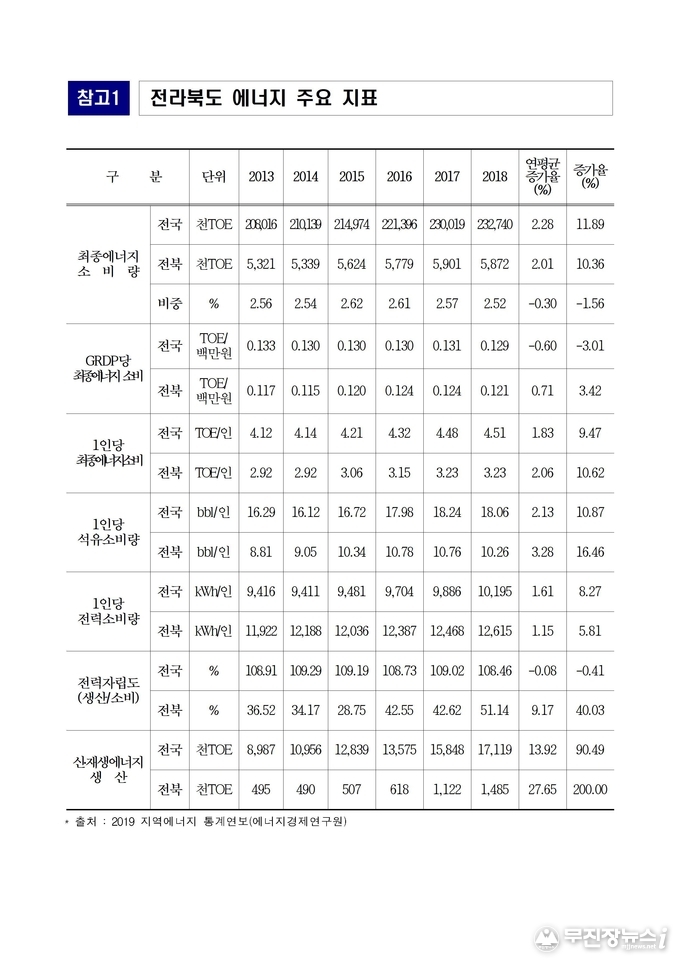 - 1인당 최종에너지소비 전국 4.51TOE/인, 전북 3.23TOE/인(2018년 기준)