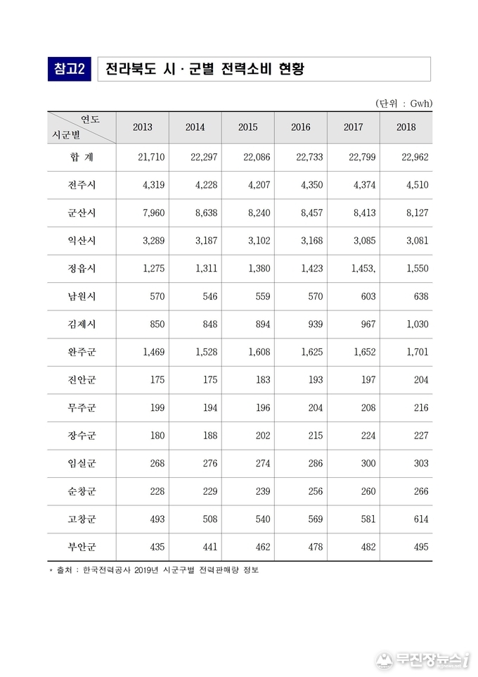 ※ 시군별 전력소비 : (1)군산시 8,127GWh, (2)전주시 4,510GWh, (3)익산시 3,081GWh