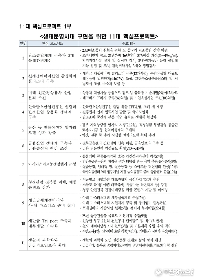 전북도가 기후변화와 4차산업혁명 시대에 대응하고 생태문명 시대를 선도해 나가기 위한 11대 핵심 프로젝트를 선정하고 본격 추진에 나선다.