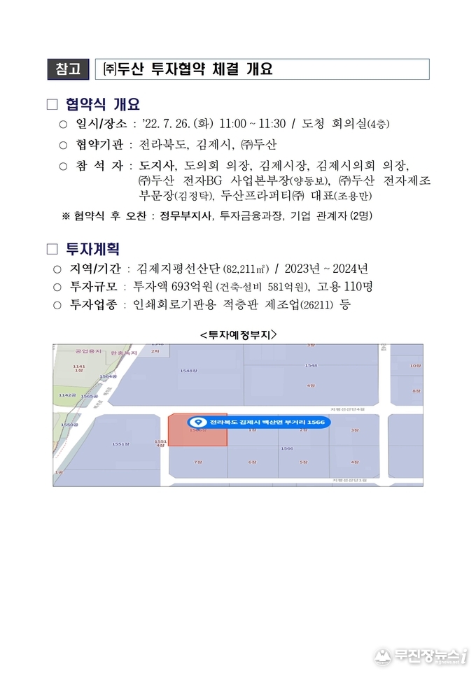 이번 협약에 따라 ㈜두산은 2024년까지 김제 지평선산단(82,211㎡)에 693억 원을 투자한다. 전라북도와 김제시는 기업의 투자가 원활히 진행되도록 행정적 지원 및 인허가 진행에 적극 협조하기로 했다.