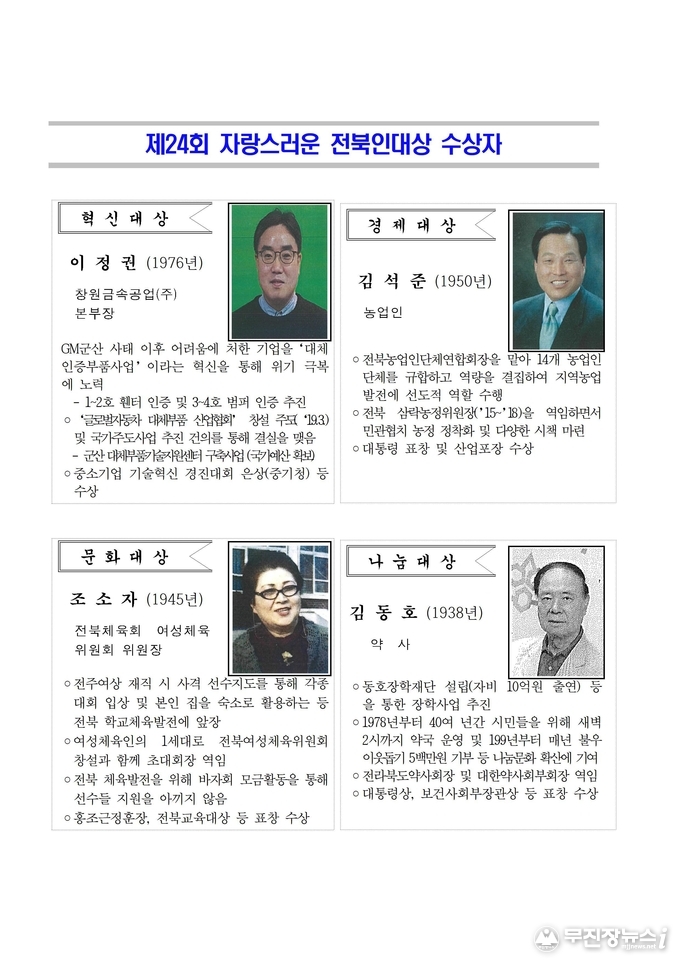 10월 25일 전북도민의 날 행사에서 상패와 메달 수여전라북도는 10월 7일 『제24회 자랑스러운 전북인 대상』 수상자 선정을 위한 본 심사위원회를 개최하고 수상자를 선정했다.