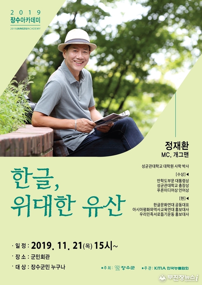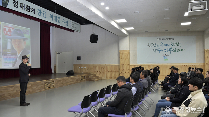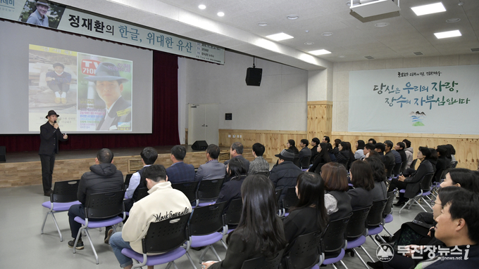 장영수 군수는 “장수군은 일제의 문화말살정책에 대항해 우리 한글을 지키기 위해 목숨까지 바친 정인승 박사님의 고장이다”며 “이곳에서 한글의 위대함과 가치를 다시 한 번 느낄 있는 강연이 열려 매우 뜻깊고 많은 분들에게 도움이 된 강연이 되길 바란다”고 말했다.