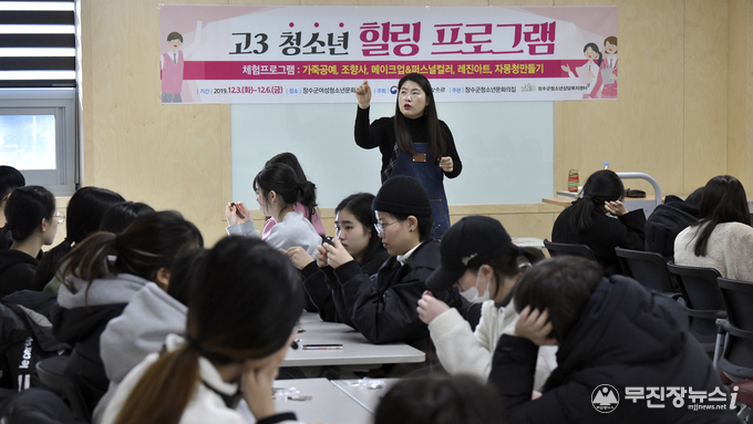 3일 장수군에 따르면 백화여고, 한국마사고, 장수고, 산서고, 등 관내 5개 고등학교 고3 159명의 학생을 대상으로 오는 17일까지 여성·청소년문화센터에서 가죽공예, 조향사, 레진아트, 메이크업 퍼스널컬러, 자몽청 만들기 등 5개 프로그램을 운영한다.