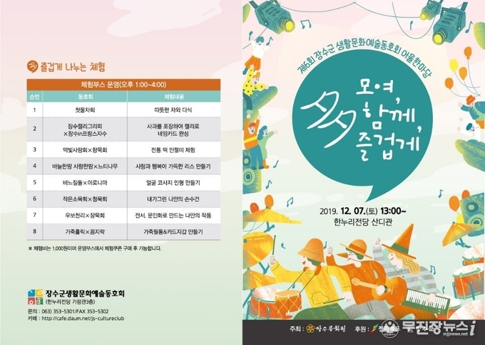 이번 행사는 ‘多 즐겁게 나누는 체험’과 ‘多함께 여는 공연’으로 나뉘어 진행되며 나누는 체험에는 첫물차회의 따뜻한 차와 다식, 장수캘리그라피·장수in프랑스자 동호회의 사과를 포장한 캘리 네임카드, 바늘한땀 사랑한땀·느티나무의 리스만들기, 바느질돌·아로니아의 얼굴 코사지 인형 만들기, 가죽홀릭·꼼지락의 가죽필통 및 카드지갑 만들기 등 16개 동호회의 9가지 체험 프로그램이 진행된다. 체험비는 1000원이며 현장에서 체험쿠폰 구매 후 사용하면 된다.