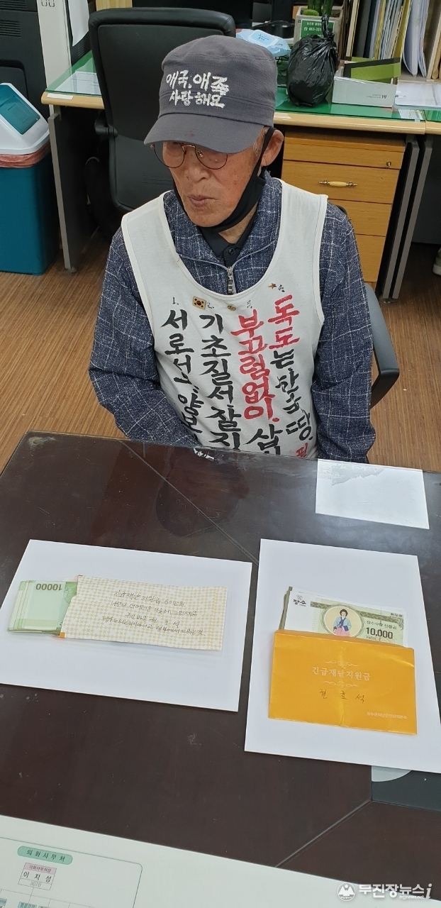 '거리의 천사'로 불리는 권호석(84·장수군 천천면)씨가 어려운 이웃을 위해 써 달라며 자신의 국가긴급재난지원금과 장수군 재난기본소득금 전액을 천천면지역사회보장협의체에 19일 기탁했다.