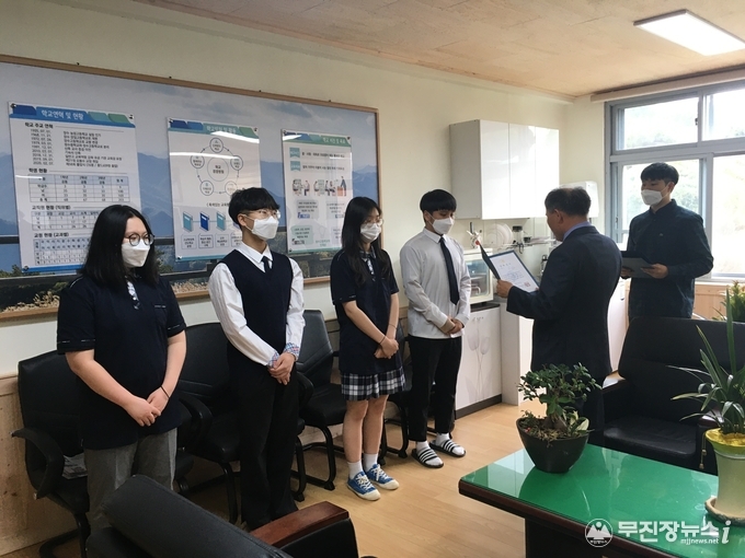 이날 장학증서 전달식은 정순호 회장과 임원들이 교장실에서 인터렉드 봉사동아리 김태훈 학생 외 3명에게 각각 50만원의 장학금를 전달했다.