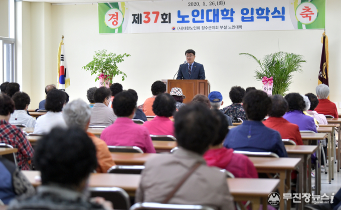 제37회 장수군 노인대학 입학식이 26일 사회복지회관 2층 회의실에서 장영수 군수, 김종문 의장, 오재영 지회장, 홍봉기 노인대학장, 입학생 등 관계자 120명이 참석한 가운데 개최됐다.