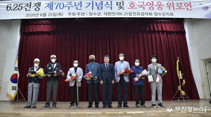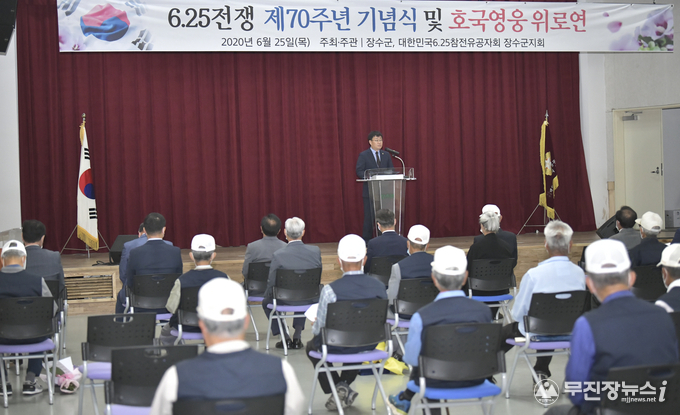 장수군은 25일 11시 장수군청 군민회관에서 6.25전쟁 제70주년행사 및 호국영웅위로연을 장영수군수, 김종문군의장, 박용근도의원, 송제근축협조합장, 한상대산림조합장 및 6.25참전 유공자와 보훈단체장, 각계기관장등 80여명이 참석하여 기념식을 실시했다.