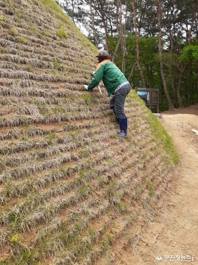 지난해 10월 1일 그 역사적·학술적 가치를 인정받아 국가사적 제552호로 지정된 동촌리 고분군은 동가야마을 윤기문 어르신이 주기적으로 풀 뽑기와 함께 고분에 잔디가 죽거나 무너진 곳은 없는지 꼼꼼히 살피고 있다.