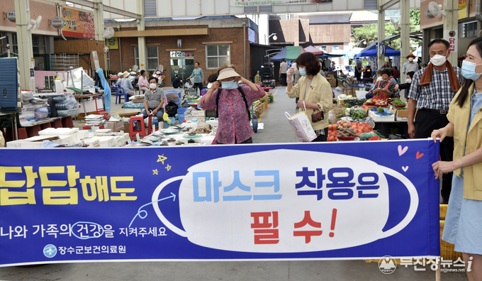 장수군은 20일 장수장날을 맞아 시장과 음식점, 커피숍 등 장수읍 일원에서 군청 직원 10여명이 참여한 가운데 실내·외 마스크 착용 의무화 이행 여부를 확인하는 등 캠페인을 집중 실시했다.