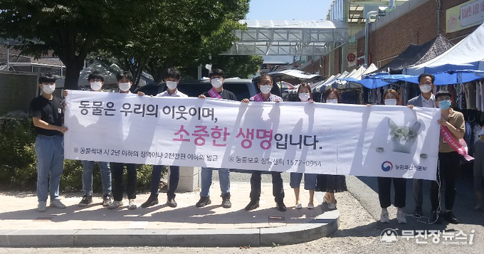 장수시장에서 진행된 이번 홍보 캠페인은 맹견 외출 시 목줄과 입마개 필수, 동물 및 유기학대 시 처벌 강화 관련 법령 계도사항 및 반려인과 비반려인 간 갈등 예방을 위한 펫티켓의 중요성을 홍보했다.