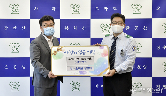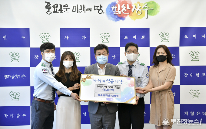 장수읍자율방범대(대표 박진성)는 31일 집중 호우로 피해를 입은 주민들을 위해 써달라며 성금 150만원을 장수군에 기탁했다.
