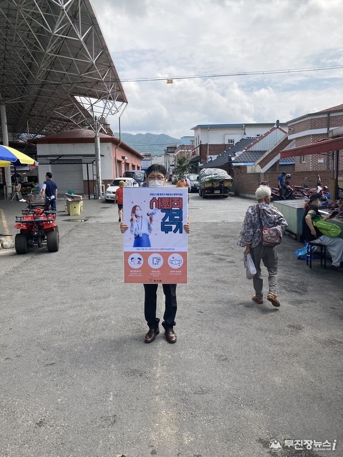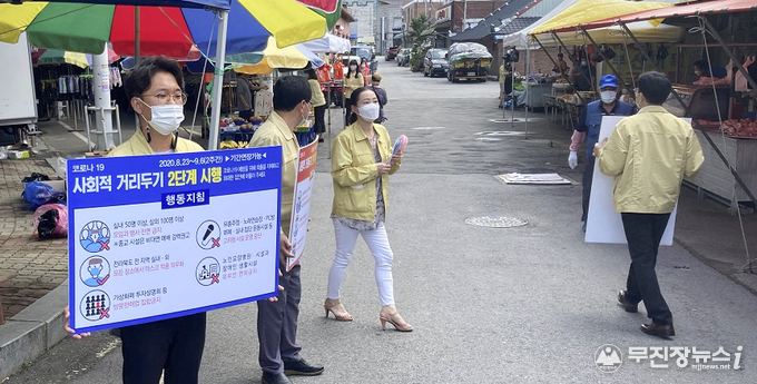 이번 사회적 거리두기 캠페인은 장날을 맞은 지난 28일 장계시장 등 관내에서 진행됐으며, ▲실내 50인·실외 100인 이상 집합·모임 금지, ▲마스크 착용 의무화, ▲공공다중시설 운영중단, ▲민간다중시설 중 고위험시설 운영 중단, ▲학교, 유치원 어린이집 등 교육 기관의 원격수업, ▲되도록 집에 머무르기 등을 홍보했다.