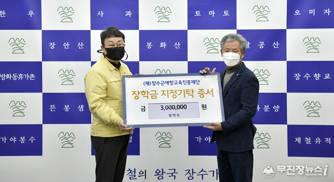 같은 날 양덕수(장계면) 씨가 지역 인재 양성을 위해 써달라며 성금 300만원을 기탁했다.