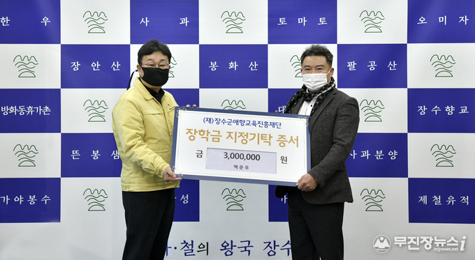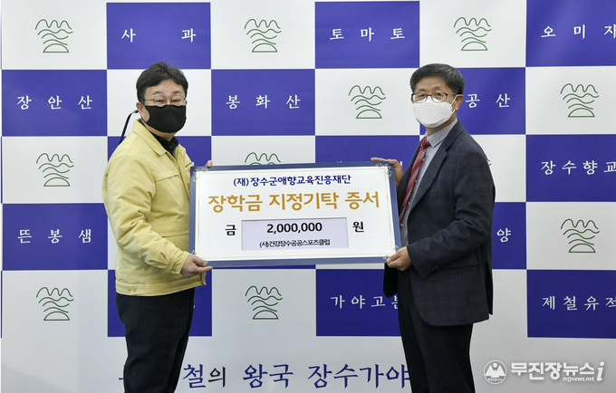 (사)건강장수공공스포츠클럽(대표 이내현)과 천천팜 대표 백준우씨는 23일 지역 인재 양성을 위해 써달라며 각각 성금 200만원과 300만원을 장수군애향진흥재단에 기탁했다.