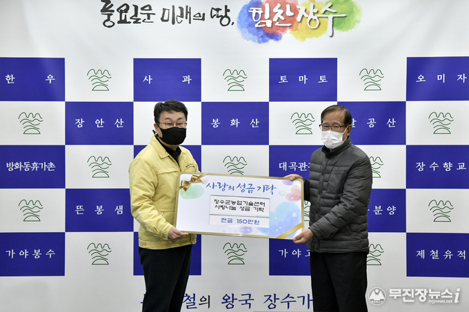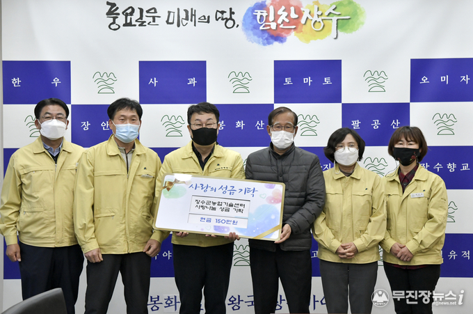 장수군농업기술센터 직원 10여명으로 구성된 ‘사랑나눔’ 봉사단체는 24일 연말연시 도움의 손길이 필요한 이웃을 돕고자 장수군에 150만원을 기탁했다.