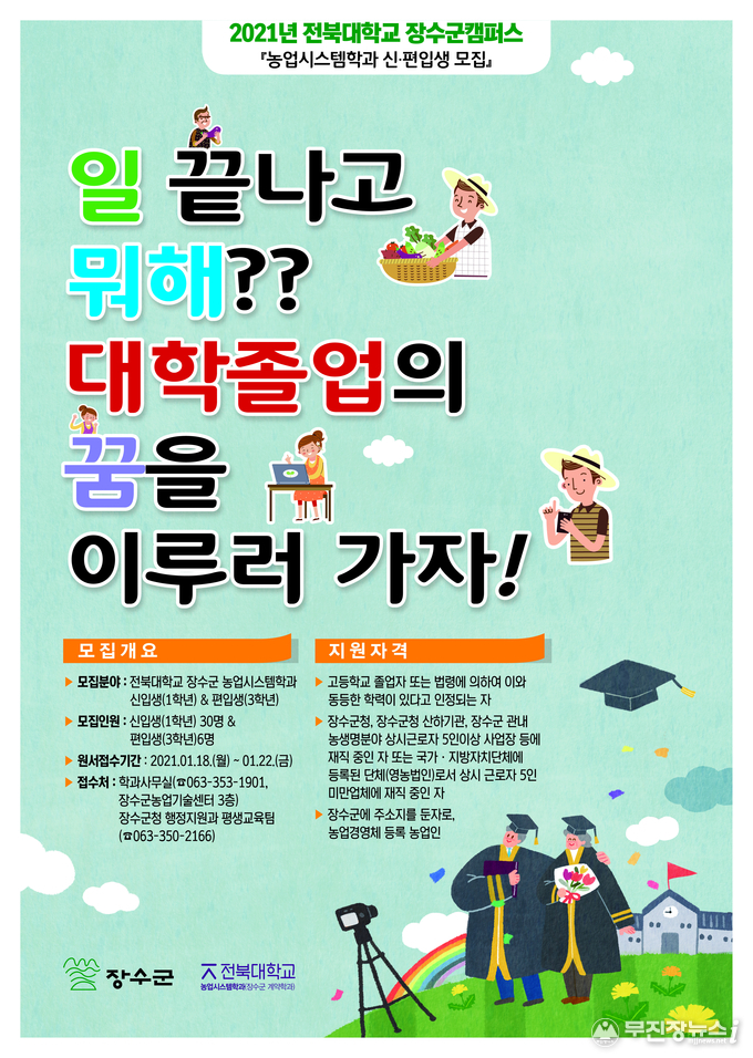 합격할 경우 등록금 50%는 장수군이 지원하며 졸업 시 전북대 농업생명과학대학 졸업과 동등한 자격이 부여된다.