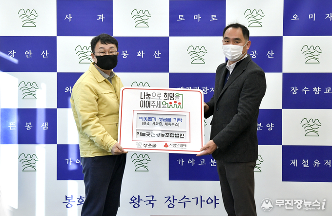 하늘곳간영농조합법인은 지난 19일 장수군을 방문하여 지역 내 어려운 이웃을 돕는 데 써달라며 성금 70만원과 사과즙 20박스, 해독주스 10박스를 장수군에 기탁했다.