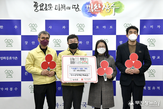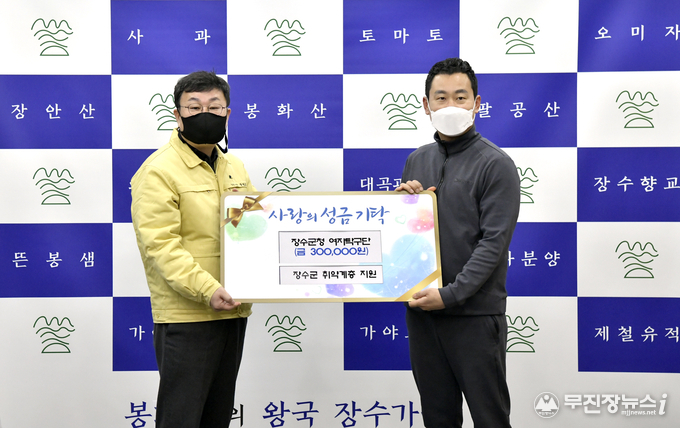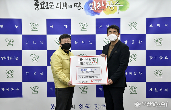 장수군장애인체육회(회장 장영수)와 장수군청 여자탁구단(감독 문보성)은 어려운 이웃을 돕는 데 사용해달라며 각 성금 30만원을 장수군에 기탁했다.