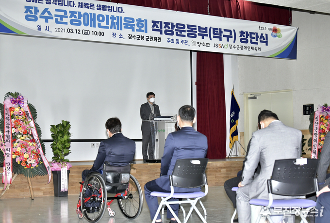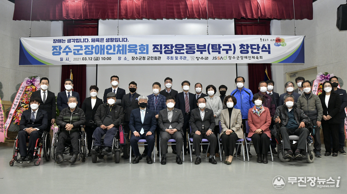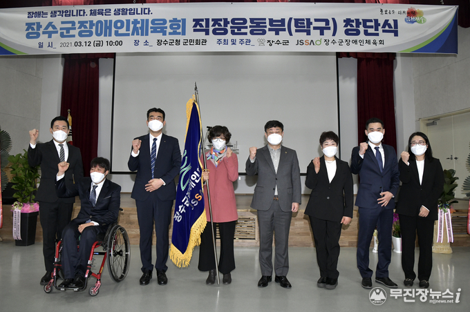 장수군장애인체육회는 12일 장수군청에서 장영수 군수, 김용문 장수군의회 의장, 권성안 장수군장애인체육회 부회장 및 협약기관 가맹단체장과 임원, 장애인탁구계 인사 등 40여명이 참가한 가운데 창단식을 가졌다. 행사는 코로나19 방역수칙을 철저히 준수하여 진행하였다.
