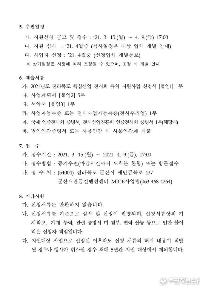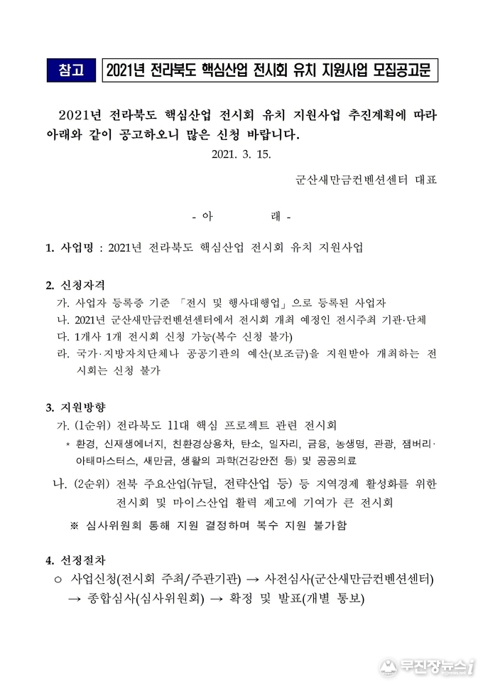 전북도는 4월 9일까지 군산새만금컨벤션센터로 신청하면 전시규모와 지역업체 등의 심사*를 통해 지원대상(3개 이상)을 선정한다는 계획이다.