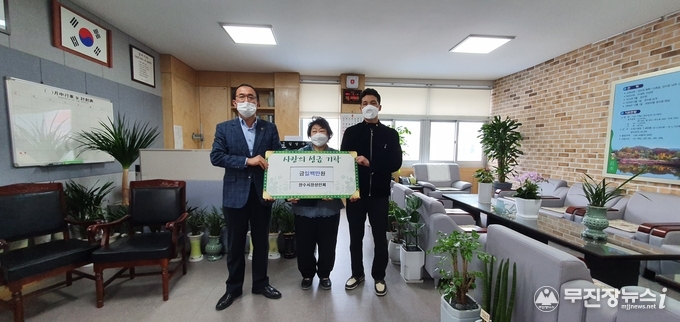 장수시장상인회(회장 조방희)는 어려운 이웃을 위해 상인들이 십시일반 모금한 100만원의 성금을 장수읍에 기탁했다.