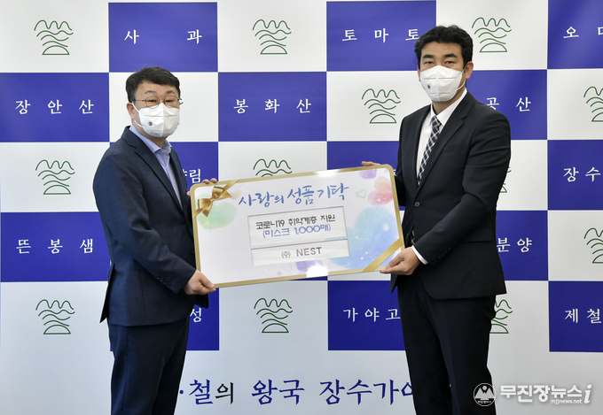 ㈜NEST(대표 김재학)은 21일 장수군과 장수군장애인체육회를 방문해 코로나19 예방에 사용해 달라며 마스크 1,000매를 기탁했다.