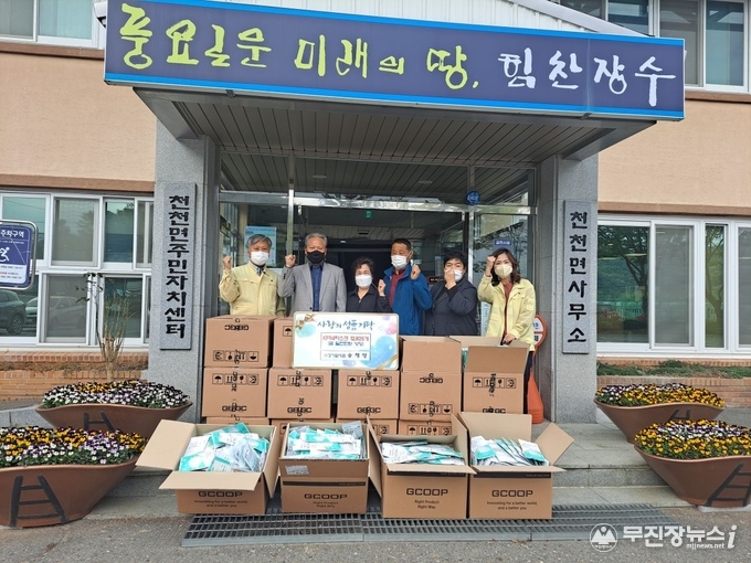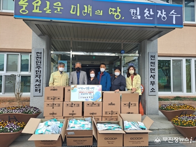 장수 천천면 출신 ㈜경기텔레콤 송재영 씨가 코로나19 장기화 극복을 위해 1,000만원 상당의 KF94마스크(12,825개)를 천천면지역사회보장협의체에 기탁했다.