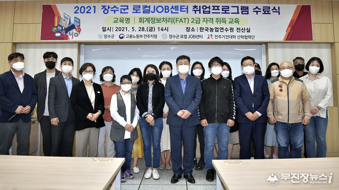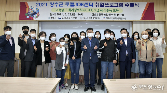 장수군로컬JOB센터(전주기전대학 산학협력단)는 2021년 회계정보처리(FAT) 2급 자격증 취득교육을 마치고 28일 한국농업연수원 전산실에서 수료식을 가졌다.