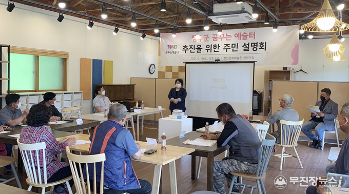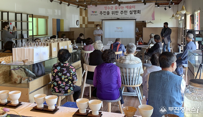 장수군과 장수문화예술협동조합은 지난 14일 장안문화예술촌에서 조합원, 대상지 주변마을 이장, 주민 등 30여명이 참석한 가운데 ‘꿈꾸는 예술터 조성사업’ 주민설명회를 개최했다.
