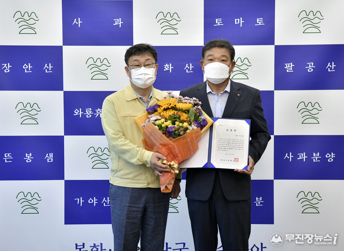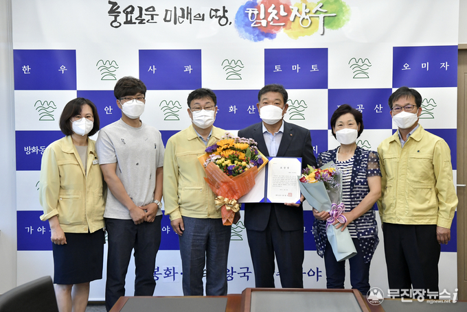 장영수 군수는 22일 군수실에서 백신 접종 후 쓰러진 이웃을 구해 인명사고 예방에 기여하고 코로나19 예방 활동에 솔선수범한 장수군 산서면 시장마을 이희술(62) 이장에게 코로나 유공자 표창을 수여했다.