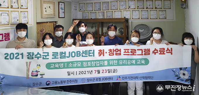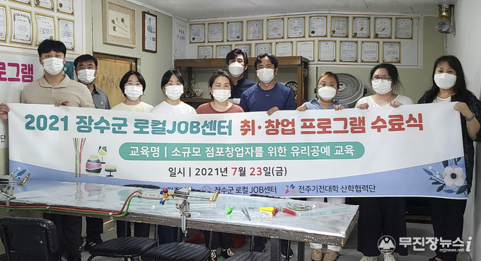 장수군 로컬JOB센터(전주기전대학 산학협력단)는 23일 장계면 소재 유리공예 교육장에서 2021년 취· 창업 프로그램인 ‘소규모 점포창업자를 위한 유리공예 교육’ 수료식을 개최했다