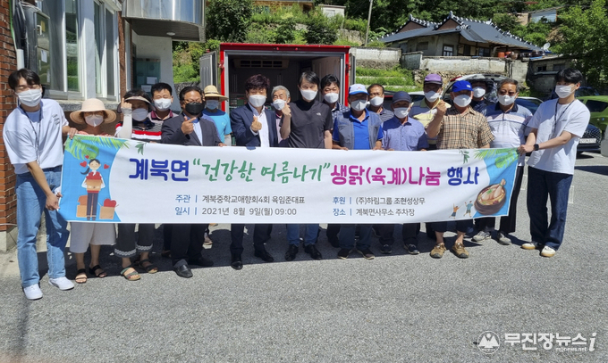 이날 행사에서는 무더위에 지친 면민들이 건강하게 여름을 보낼수 있도록 계북중학교애향회에서 생닭(육계) 800마리를 제공했으며, 이는 계북면 780여가구에 전달했다.