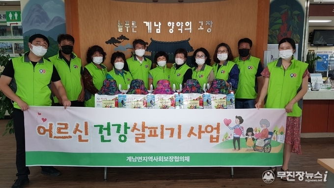이번 사업은 2021년 계남면지역사회보장협의체 신규사업으로, 위원들이 관내 어르신 30세대를 직접 방문해 환절기 어르신들의 건강을 살피고 협의체 위원들이 자체기금으로 마련한 꾸러미(모자, 토시 등)를 전달했다.