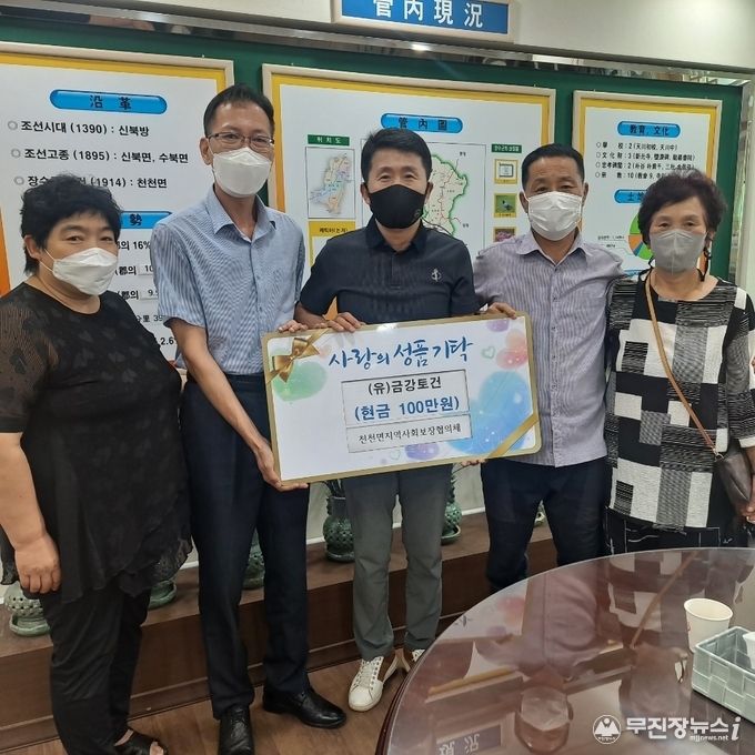 장수군 천천면 소재 (유)금강토건(대표 서인선) 직원들은 추석을 맞이해 어려운 이웃을 위해 써달라며 지난 7일 천천면지역사회보장협의체에 100만 원을 기탁했다.