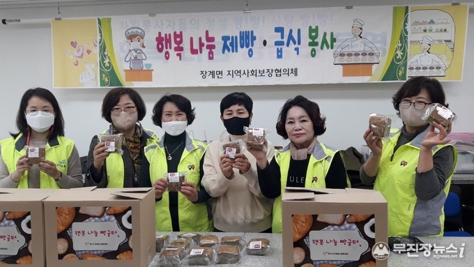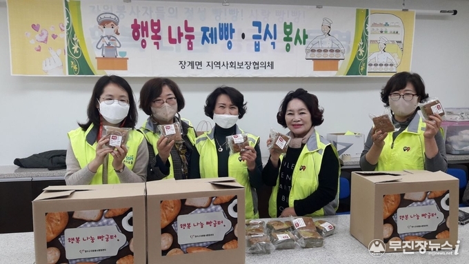 장수군 장계면 지역사회보장협의체(공동위원장 양정숙·이광춘)는 5일 협의체 위원들과 장수군 자원봉사종합센터에서 행복 나눔 제빵봉사 활동을 진행했다.