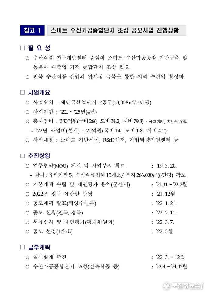 특히, 전북도의 강력한 의지를 표현하고자 신원식 정무부지사는 대면평가(발표및질의응답)에 직접 참석하여 수산가공종합단지를 신재생에너지를 접목시킨 융복합 산업단지로 만들겠다고 피력해 심사위원들의 공감을 얻어냈다.