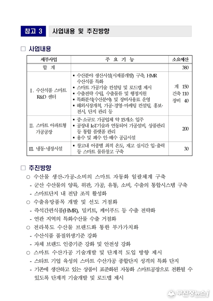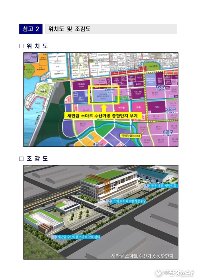 이번에 선정된「새만금 스마트 수산가공 종합단지」는 2022년부터 4년간 국비 266억 원 등 총사업비 380억 원을 투입하여 33,058㎡ 부지에 14,050㎡ 규모의 5개 시설을 구축한다.