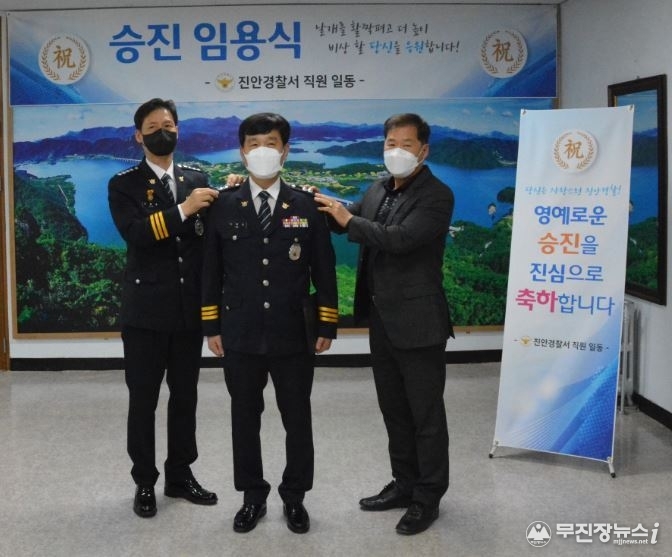 진안경찰서는 3일 서장실에서 이휴상 경감의 영예로운 승진 임용식을 개최했다. 이 날 행사는 코로나19로 실내 방역수칙을 준수하며 경찰서 각 과장, 동료 직원이 참석하여 계급장을 부착하고 꽃다발을 수여하는 등 승진 임용을 축하했다.