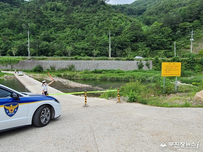 진안경찰서는 23일 부귀에서 장마철 집중호우로 인한 도로 및 교량 침수에 대비하고자 교통통제 등 훈련을 실시했다.