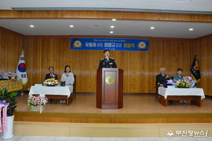 진안경찰서(서장 김홍훈)는 24일 서장실에서 각 과장 및 직협회장 등 참석한 가운데 유동하 경정, 최정규 경감 2명에 대한 상반기 영예로운 퇴임식을 가졌다.