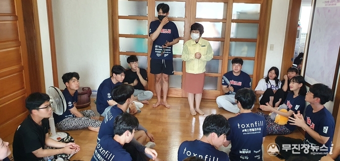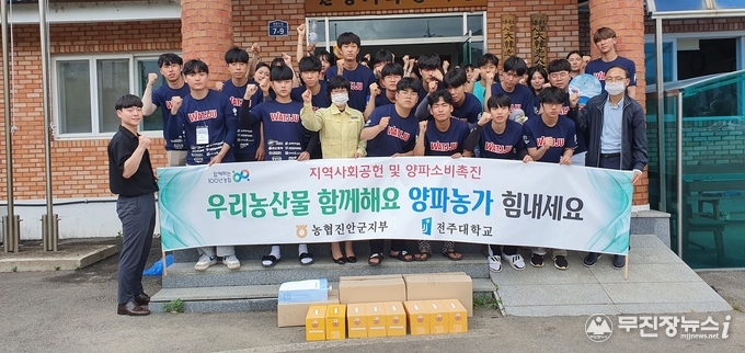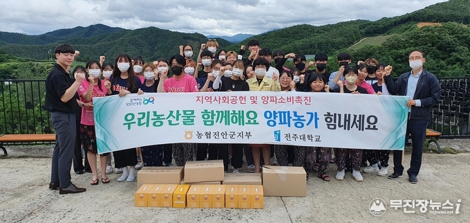 NH농협진안군지부(지부장 정미경)는 지난 29일, 전주대 농촌봉사단 120여명이 여름방학을 맞아 농촌일손돕기를 하고 있는 진안군 가막마을과 원평지마을을 방문해 양파빵(100만원 상당의 물품)을 전달하며 격려활동을 했다.