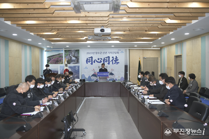 최훈식 군수가 2일 군청 회의실에서 신년 기자 간담회를 갖고 “민선8기 주요사업이 실질적으로 시작되는 올해는 신속하고 실행력있는 사업추진으로 장수군이 대도약하는 원년이 될 것”이라고 말했다.