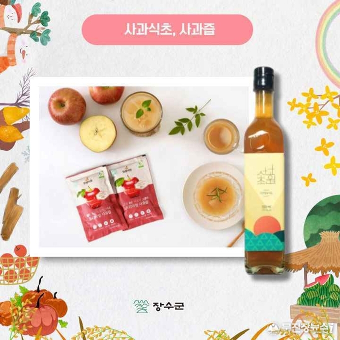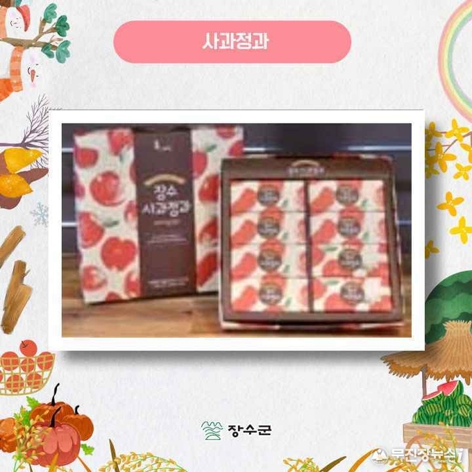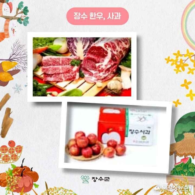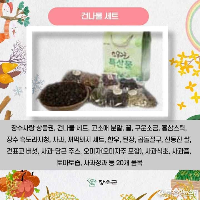 장수군은 고향사랑기부제 답례품으로 △장수사랑상품권 △사과 △한우 △오미자 △건나물세트 △고소애분말 △꿀 △구운소금 △홍삼 △흑도라지청 △곱돌절구 △꺼먹돼지세트 △된장 △쌀 △건표고버섯 △사과,토마토,당근 가공식품 등 장수군의 특색을 담은 20개 품목을 제공한다.