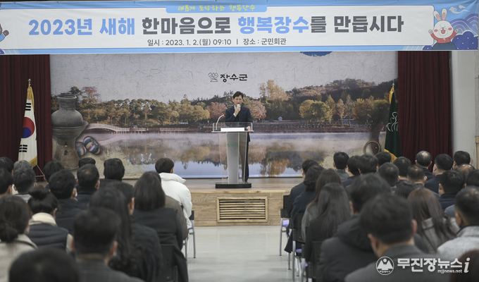 장수군이 2023년 계묘년 새해를 맞아 2일 군민회관에서 최훈식 군수를 비록해 200여 명의 공직자가 참석한 가운데 2023년 시무식을 갖고 새해 첫 업무를 시작했다.